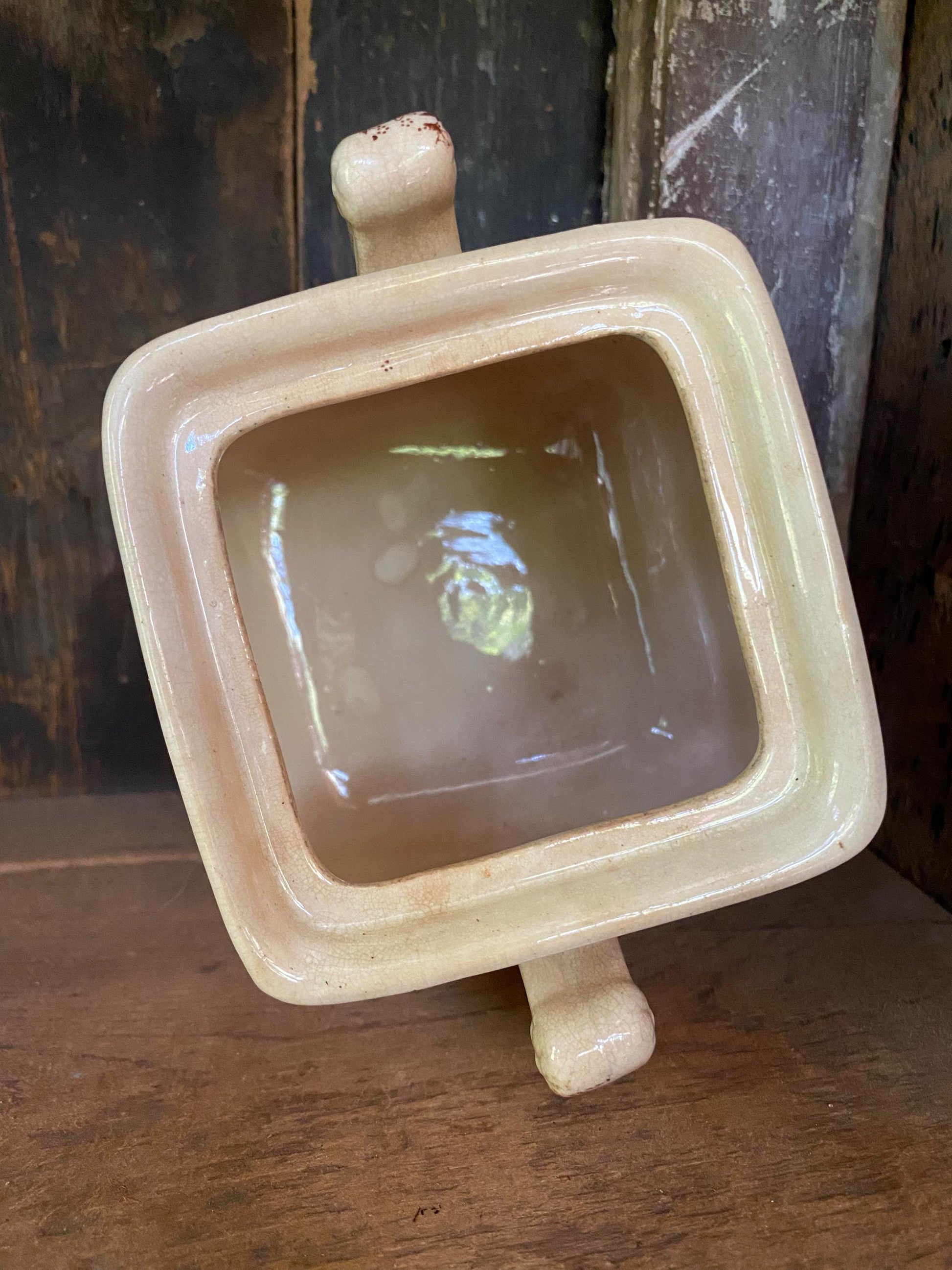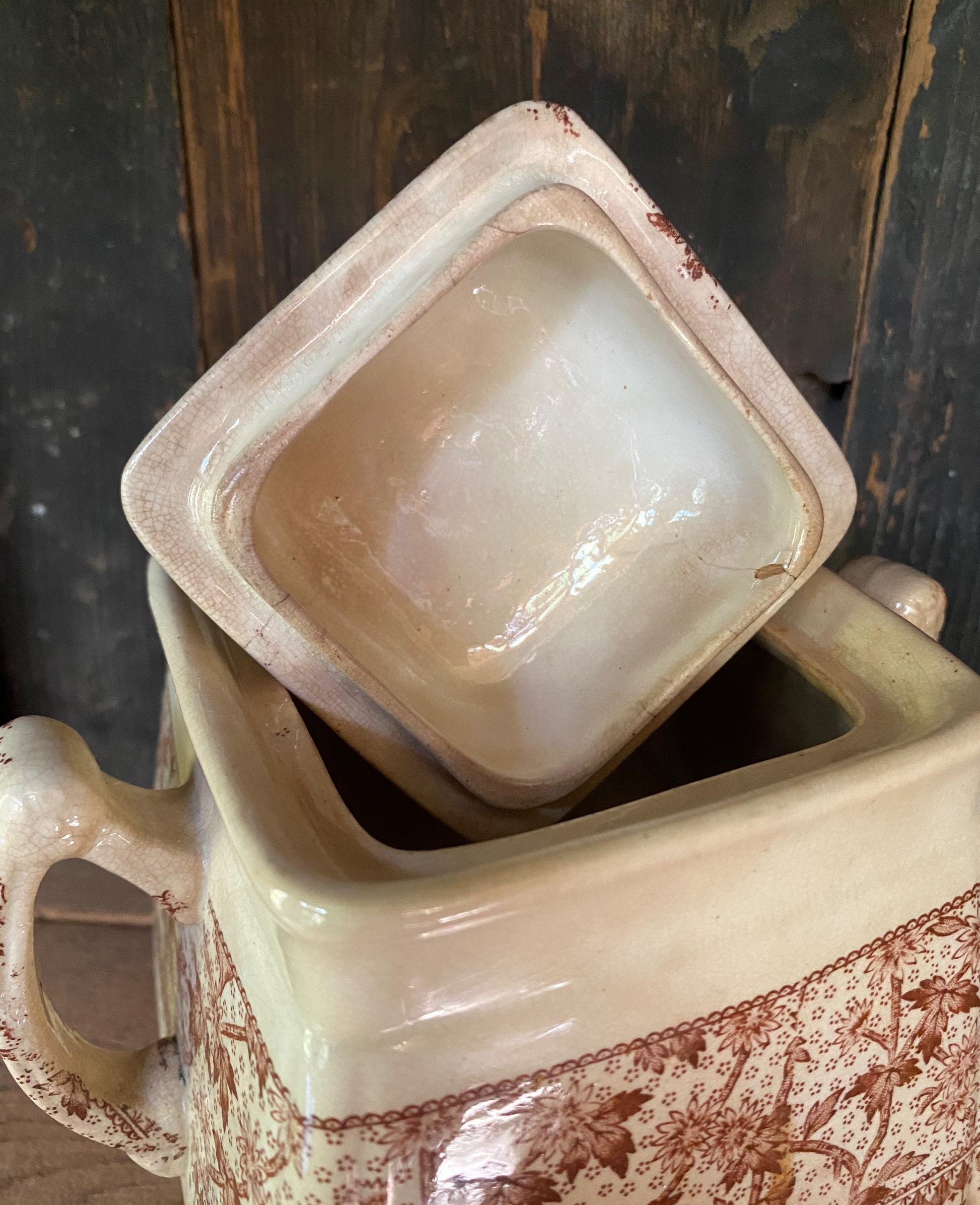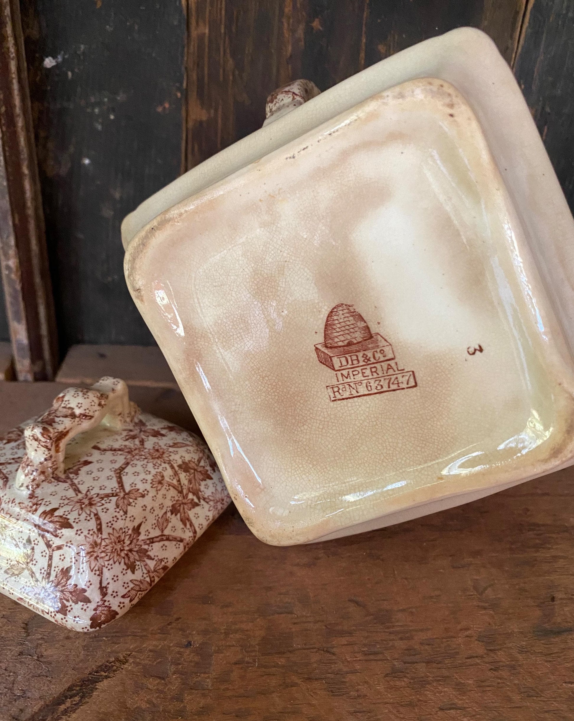 This is a stunning antique lidded sugar bowl for the crazed & stained collector! DB & Co Staffordshire England 1885, with beautiful brown transfer in the Imperial pattern. There is a lovely amount of staining, and no chips or breaks-- there is a hairline crack on the lid as pictured. It's a beautiful example of Staffordshire transferware and would look incredible in any display.