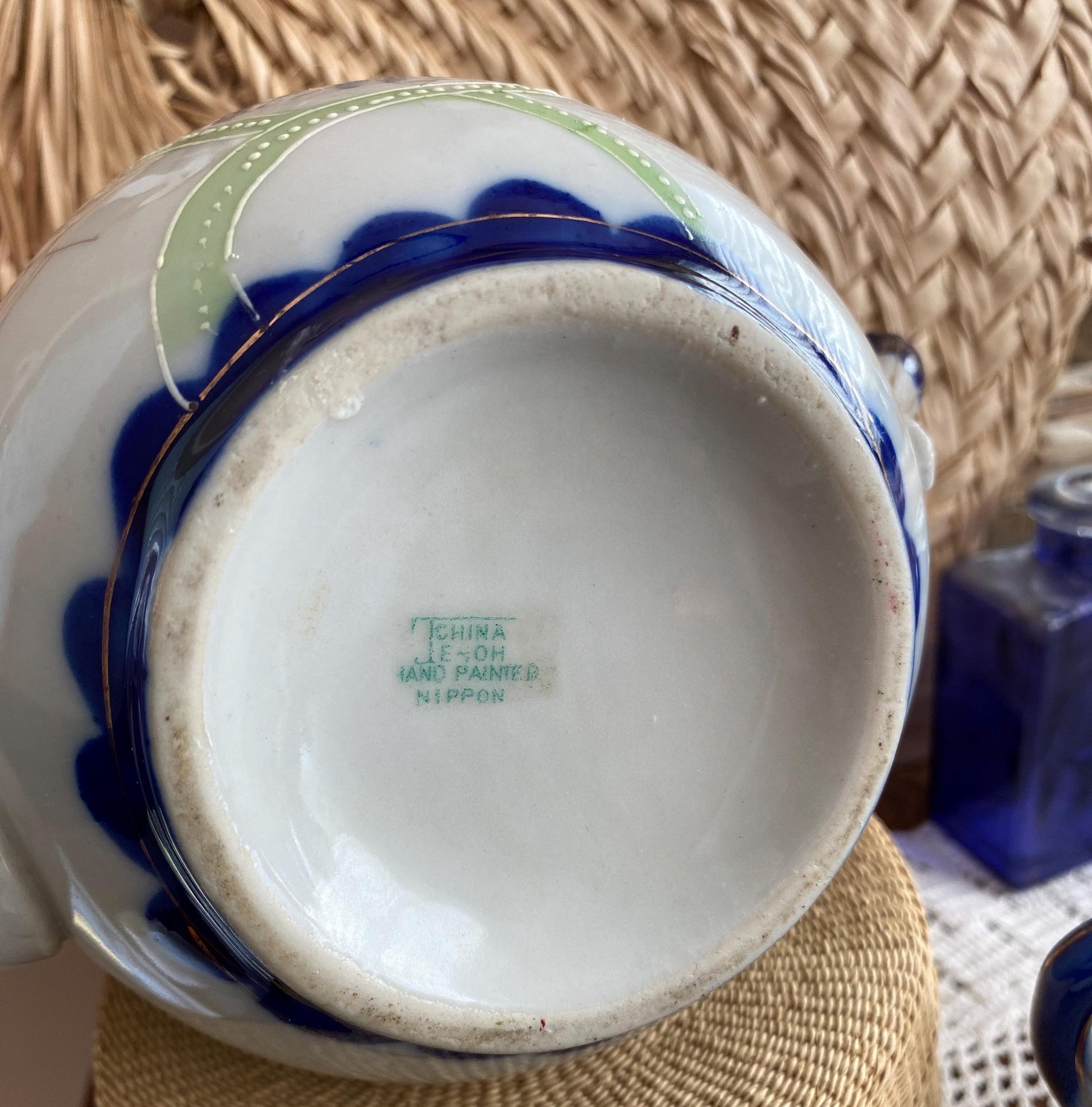 Add a beautiful set of Nippon to your collection! The teapot, sugar bowl, and three teacups are in wonderful condition. Hand-painted in cobalt blue with roses. It's the quality you would expect from Nippon, made in Japan. There are no cracks or chips that I am able to see.